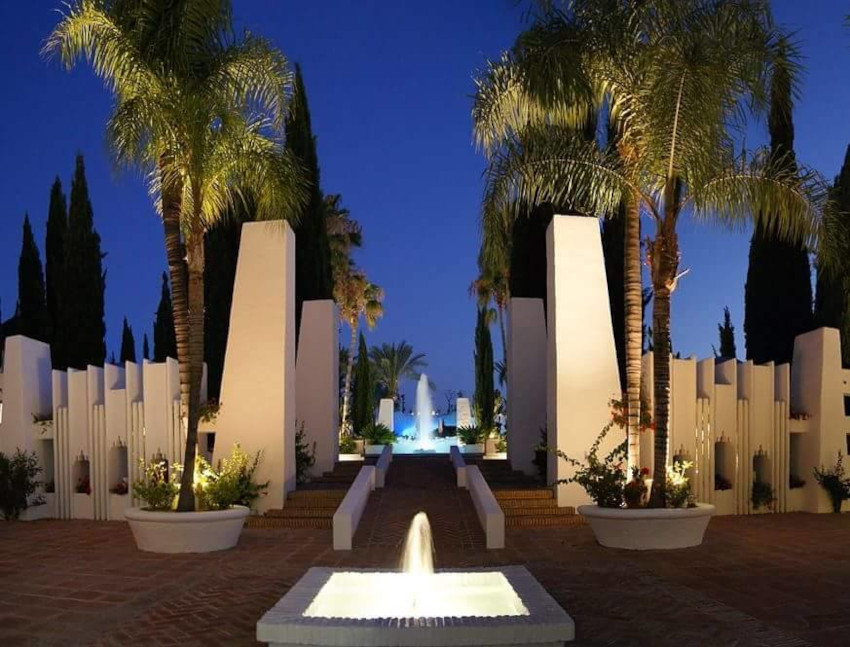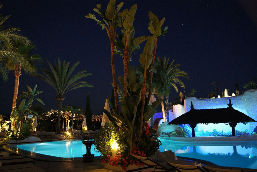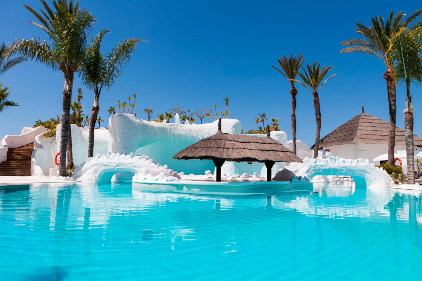 Los jardines del hotel están en la Costa Tropical, son de estilo árabe andaluz y tienen cascadas, puentes y grutas que comunican con las piscinas.